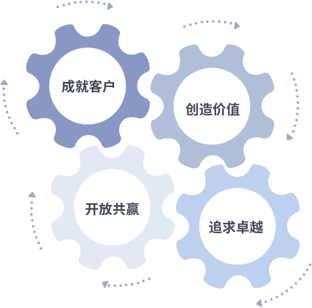 成就客户是一切决策的出发点,,,创造价值是衡量所有工作的标准,,追求卓越是我们做事做人的态度,,,,开放共赢是我们的格局也是最终的结果。。价值观的齿轮环环相扣,,推动着组织里的每个人不断向前。。。