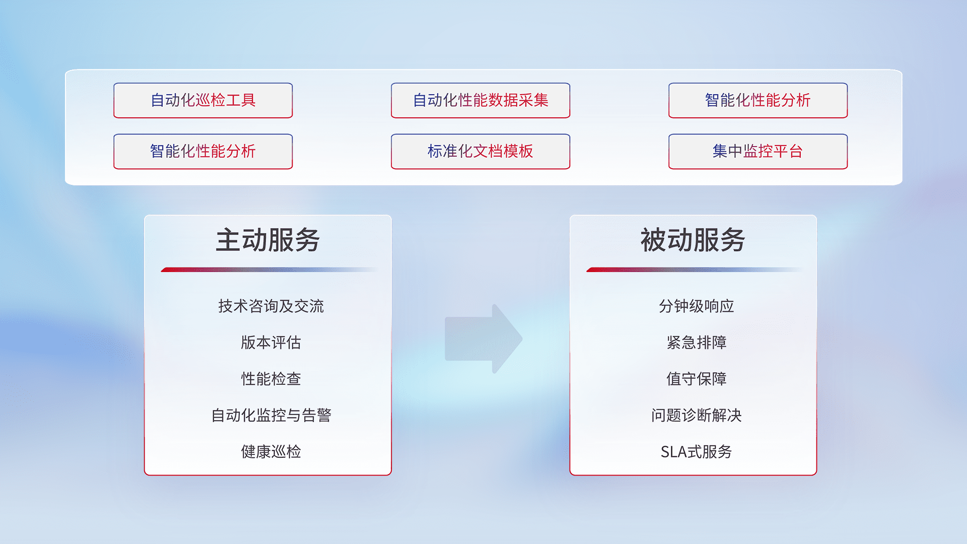 智能化工具和标准化文档,,,,保障服务质量,,,,提供主动服务(包含技术咨询、、、、版本评估、、性能检查、、、自动化监控与告警、、健康巡检)和被动服务包含(分钟级响应、、、紧急排障、、值守保障、、问题诊断解决、、、SLA服务)。。。。